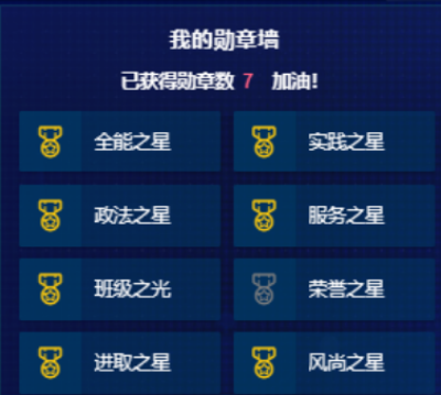 三是荣誉勋章彰显荣耀。考评系统具有“勋章墙”功能,可以根据学生得分来源及其在年级中的排名,自动生成8种勋章;