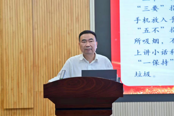他指出,学生要做到“三带、三要、五不、一保持”。“三带”指学生上课时带书包、带教材、带学习用品;“三要”指学生要认真完成学习任务,要着装整齐,要在课前将手机放入手机袋;“五不”指学生不得带食品(物)进教学楼,不得在室内公共场所吸烟,不得上课时迟到早退,不得在课堂上睡觉,不得在课堂上讲小话和随意走动;“一保持”指学生应保持教学楼内的卫生,不可随地吐痰、乱扔垃圾。