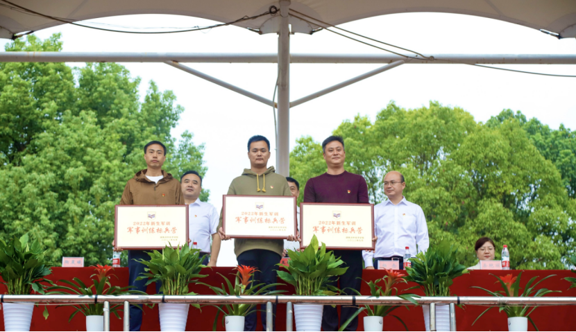 鞠晨曦副校长主持军训总结表彰仪式,陈斌副校长宣读军训表彰决定,校领导为先进集体和优秀个人颁奖。表彰过后,2022级新生开学典礼隆重举行,教师代表刘鸣、新生代表刘蕴林分别上台发言,王耀中校长发表迎新致辞。