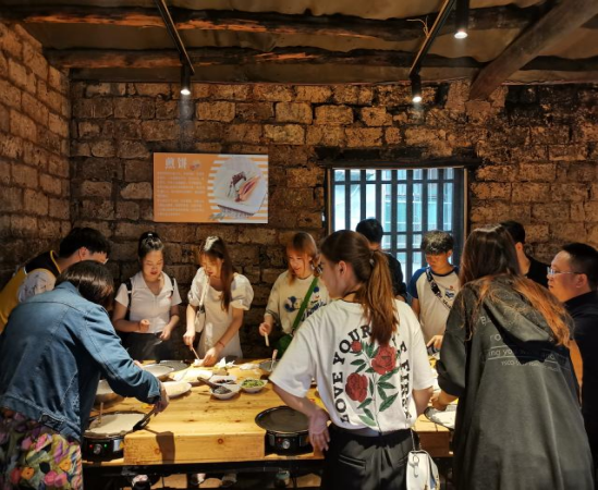 仪式结束后,全体师生党员一起前往乌石峰村“三十六坊”开展了实践活动。乌石峰村在上世纪二、三十年代,是周边乡镇的主要集中区。原有各种手工作坊,人称“九厅十八坊”,每逢集市,人声鼎沸,盛况空前。今日乡村三十六坊,依据老作坊的历史故事,将各类工作坊修整加固,一一还原呈现当年盛况。目前已开放的体验坊有:扎染坊、陶艺坊、面条坊、煎饼坊、豆作工坊、大湾学堂等。是集手工体验、劳动教育、党性教育、学校研学实践活动为一体的多功能综合基地。