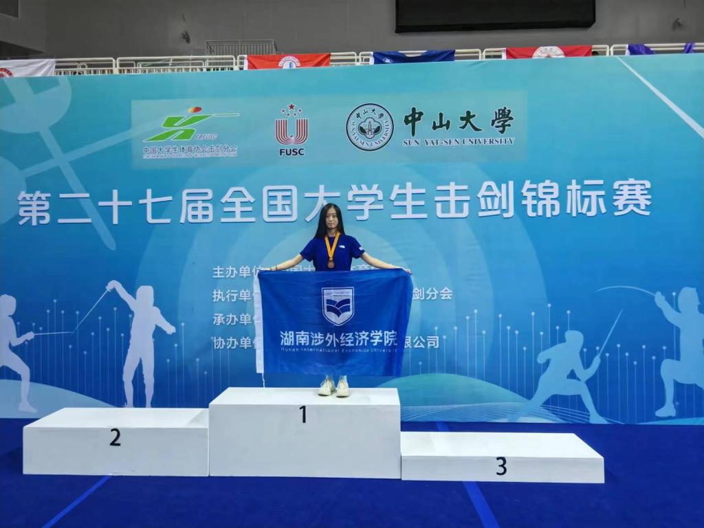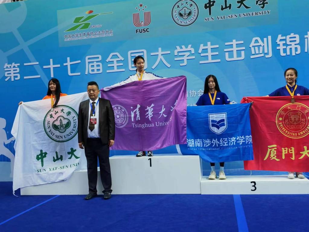 10月17日,我校音乐学院凌雅蔷同学在第27届全国大学生击剑锦标赛上获得女子佩剑铜牌,与来自清华大学、中山大学、厦门大学的运动员共同登上领奖台。