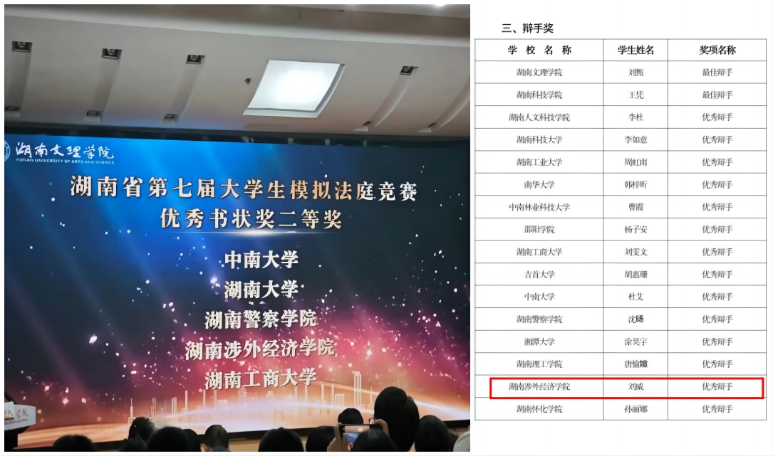 10月20日至22日,我校人文艺术学院法律系代表队前往常德参加第七届湖南省大学生模拟法庭竞赛。本次比赛由省教育厅主办、湖南文理学院承办,共有中南大学、湖南大学、湖南师范大学、湘潭大学和湖南涉外经济学院等22所高校参与,经过小组赛、复赛、半决赛、决赛的层层角逐,法律系代表队荣获湖南省第七届大学生模拟法庭竞赛优秀书状二等奖,2021级学生刘威荣获“优秀辩手”称号。