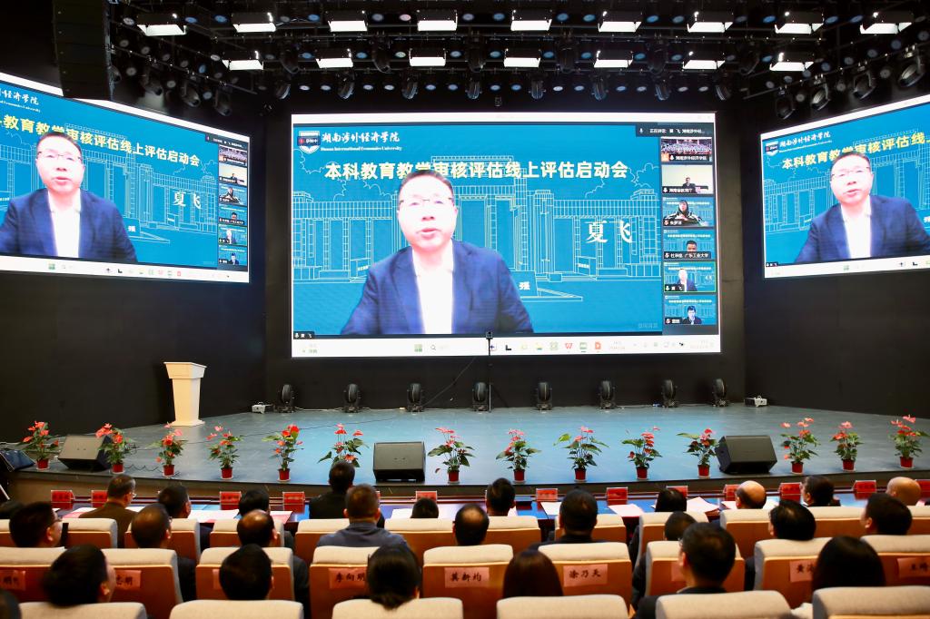 湖南省教育厅高等教育处处长刘奇军在会上讲话。审核评估专家组组长、广西财经学院校长夏飞作审核评估工作部署。校长王耀中代表学校致辞。审核评估专家组全体成员,湖南省教育厅高等教育处副处长王荣线上参会。