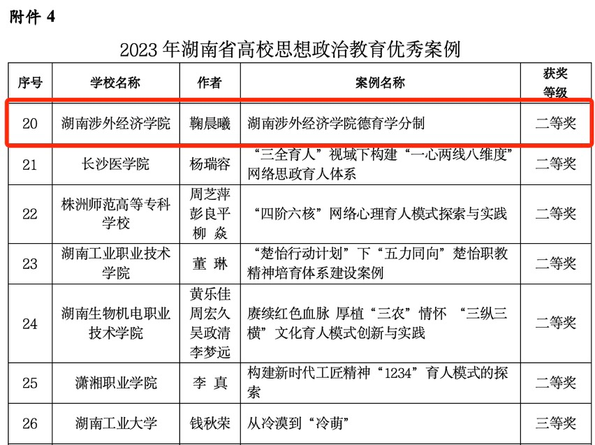 近日,省教育厅公布了2023年湖南省高校思想政治教育优秀案例。我校副校长鞠晨曦撰写的案例《湖南涉外经济学院德育学分制》获评省级二等奖。