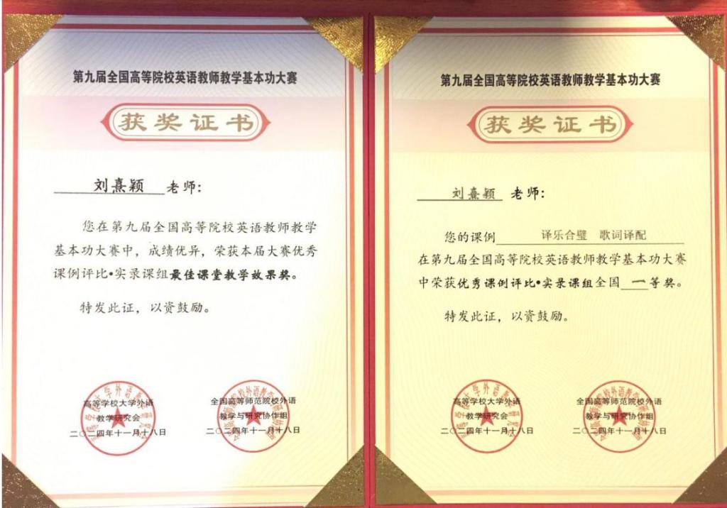 来自全国上百所高校,共计546名教师及团队参加了说课、微课及实录课三个组别赛事。刘熹颖老师凭借其生动的课堂与创新的教学设计,不仅获得实录课组一等奖第一名的好成绩,更获得单项“最佳课堂教学效果奖”,其课堂风采获得全场专家评委一致好评。其课堂展示内容主题为“译乐合璧、歌词译配”主要探讨歌曲翻译,通过设置AI翻译场景引入以及人机译文对比、学生译文对比、小组合译、现场译唱等多样课堂活动,最后成功产出《我和我的祖国》歌曲译文,学生全程积极参与,学习热情高涨。
