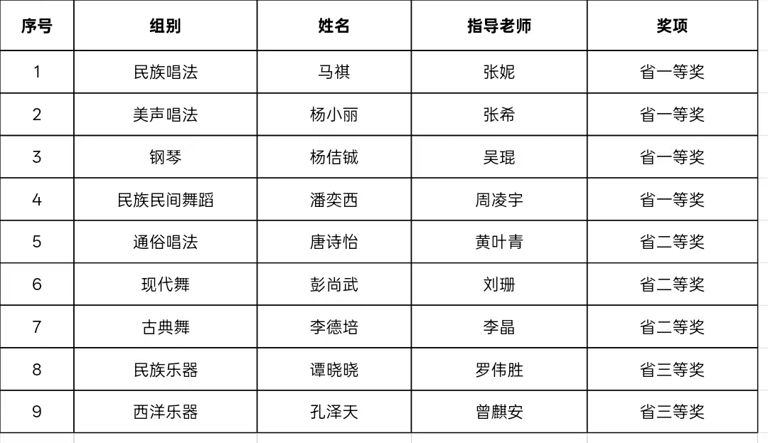 近日,由湖南省教育厅主办、湖南人文科技学院与湖南省中小学美育教学指导委员会共同承办的湖南省第十三届本科院校音乐舞蹈专业学生“独唱、独奏、独舞”比赛圆满落幕。我校音乐学院参赛学子凭借扎实的专业功底与出色的舞台表现力,在比赛中脱颖而出,共斩获一等奖4项、二等奖3项、三等奖2项,总计9个奖项,成绩斐然。
