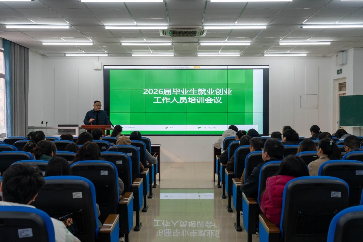 为深入学习贯彻党的二十大和二十届二中、三中全会精神以及全国教育大会精神,全面落实《中共中央 国务院关于实施就业优先战略促进高质量充分就业的意见》和省委、省政府有关决策部署,我校多举措并进,全力做好2026届毕业生就业创业工作。为促进各学院更加科学、及时掌握毕业生的就业情况和就业形势,提高工作效率和就业工作准确性,12月31日上午,招生就业处组织召开了就业创业工作人员培训会,副校长王萍、招生就业处处长涂乃天、各学院就业干事、毕业班辅导员参加此次培训会。
